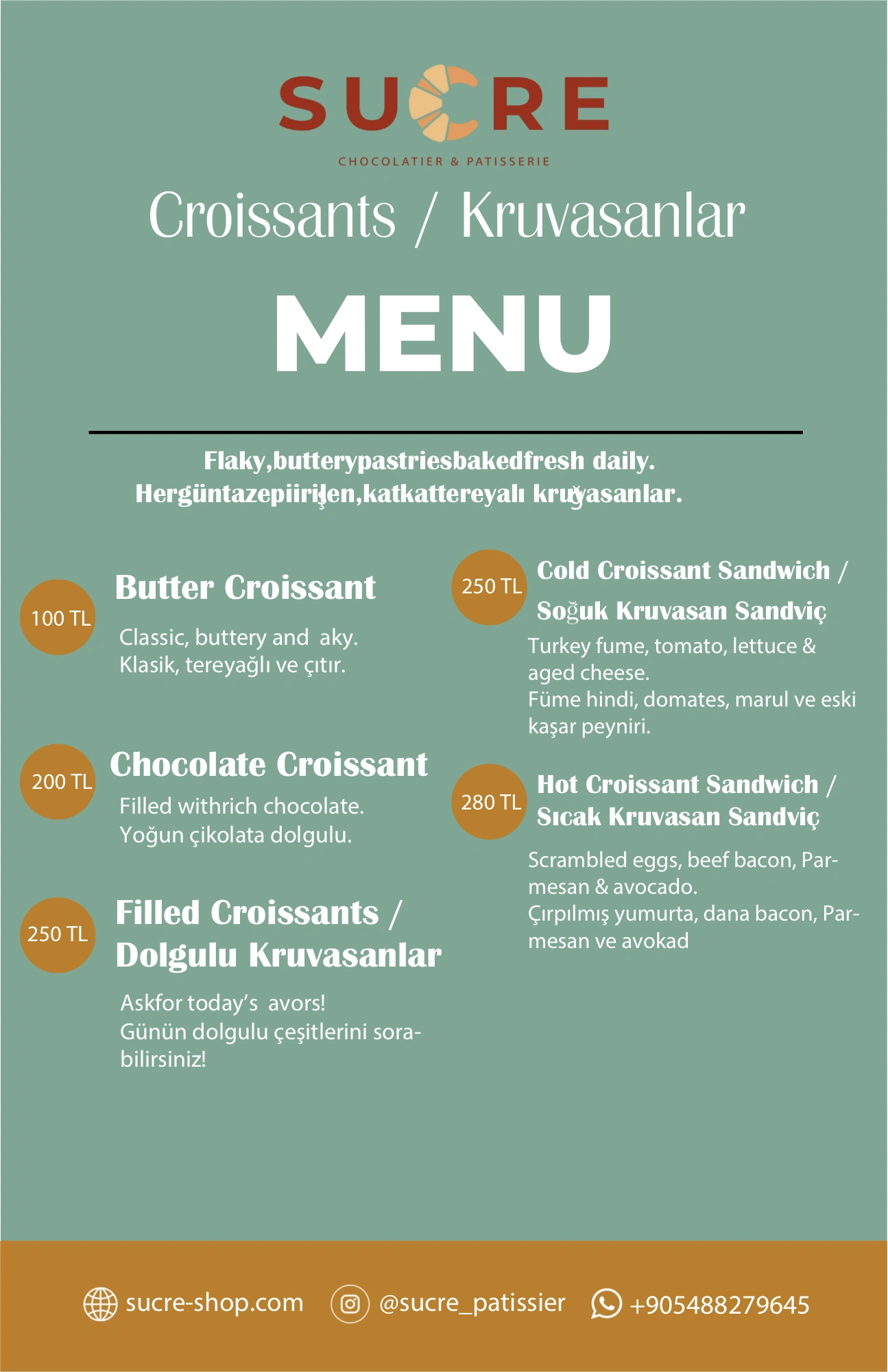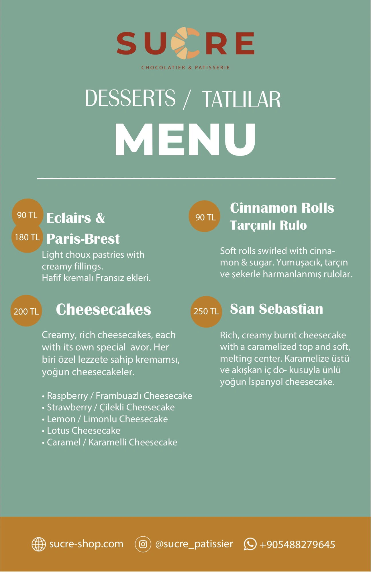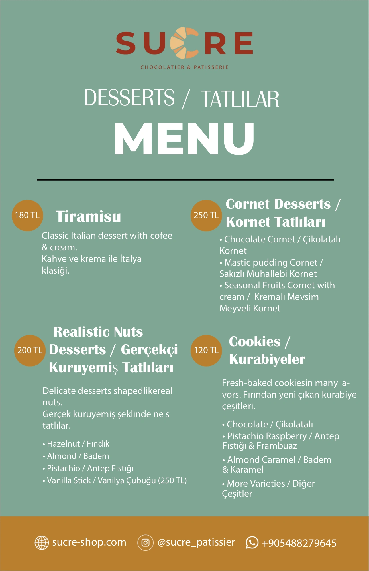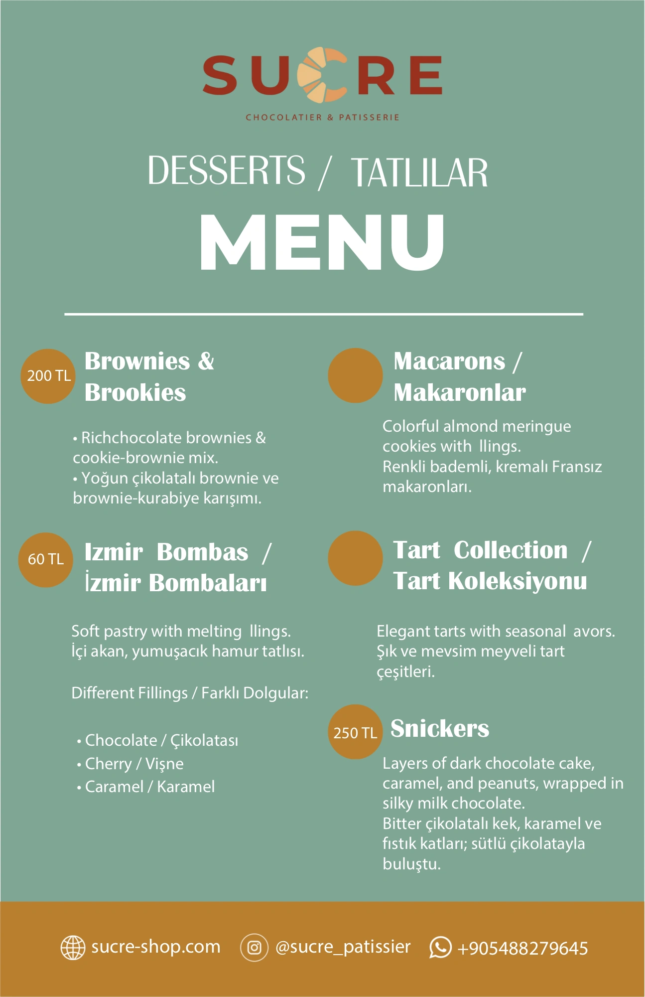 Sucre patissier and chocolatier , en taze ve en lezzetli tatlıları sunmayı amaçlayan bir tatlı dükkanıdır. Müşterilerimize sunduğumuz her bir tatlı, kaliteli malzemelerle hazırlanmakta ve damak tadınıza hitap etmektedir.